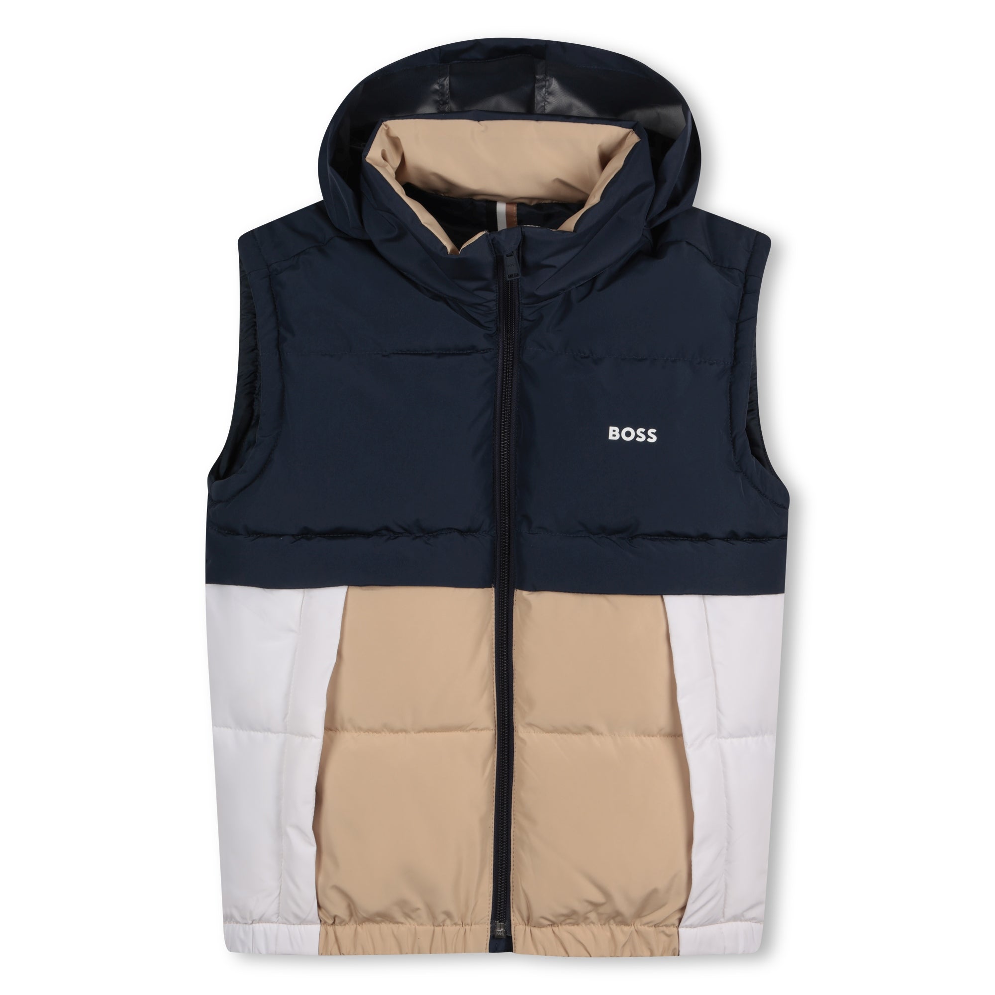 This BOSS body warmer is a must-have for when the days start to get chilly. A tab protects the top of the zip. This tricoloured design features the logo printed on the left chest and a woven label on the back. It also includes pockets on the front.